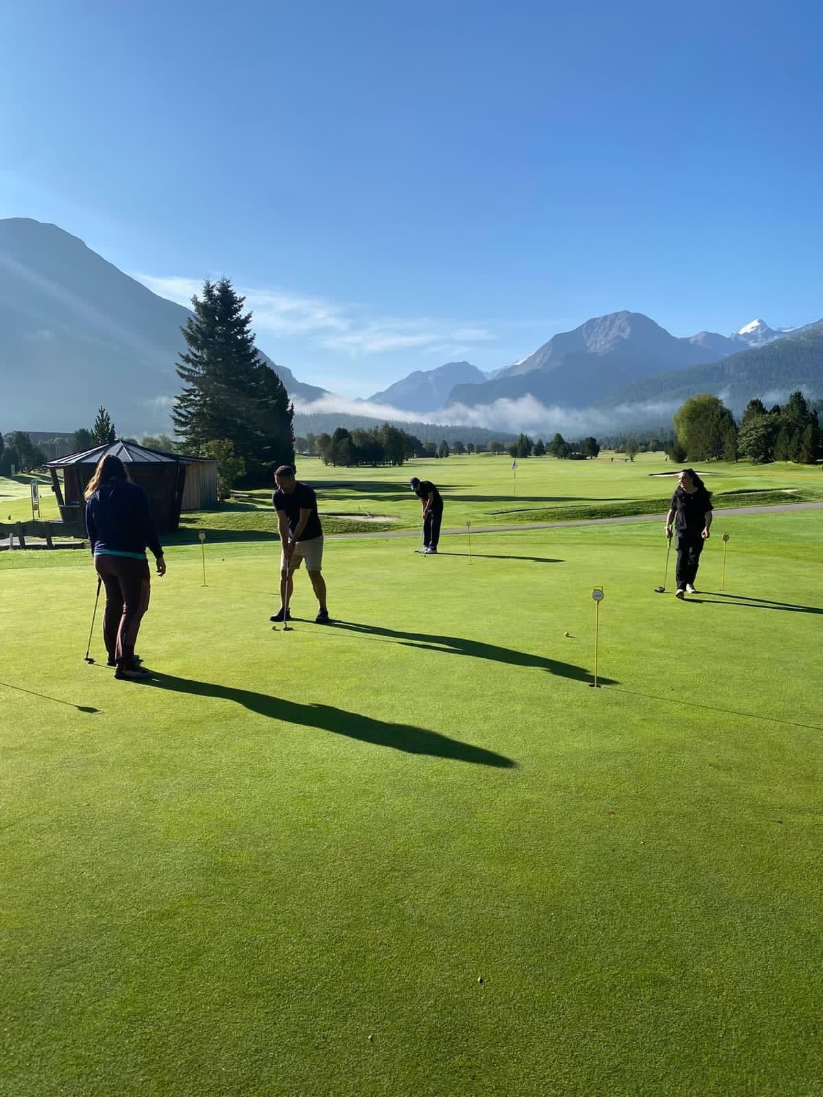 Der Morgen begann mit einer spannenden Golfrunde. Wir trafen uns früh bei der Driving Range in Samedan, wo wir von den Golftrainern eine kurze Einführung in die Grundlagen des Golfspiels erhielten. Nach einer kurzen Einweisung ging es auf die Golfanlage. Es machte viel Freude, die Schläger zu schwingen und das Grün zu besuchen. Einige von uns konnten dabei ihre Fähigkeiten im Golfen verbessern, während andere einfach den Wettbewerb und den Spass genossen. Das Wetter war ideal, was den Tag noch angenehmer machte.