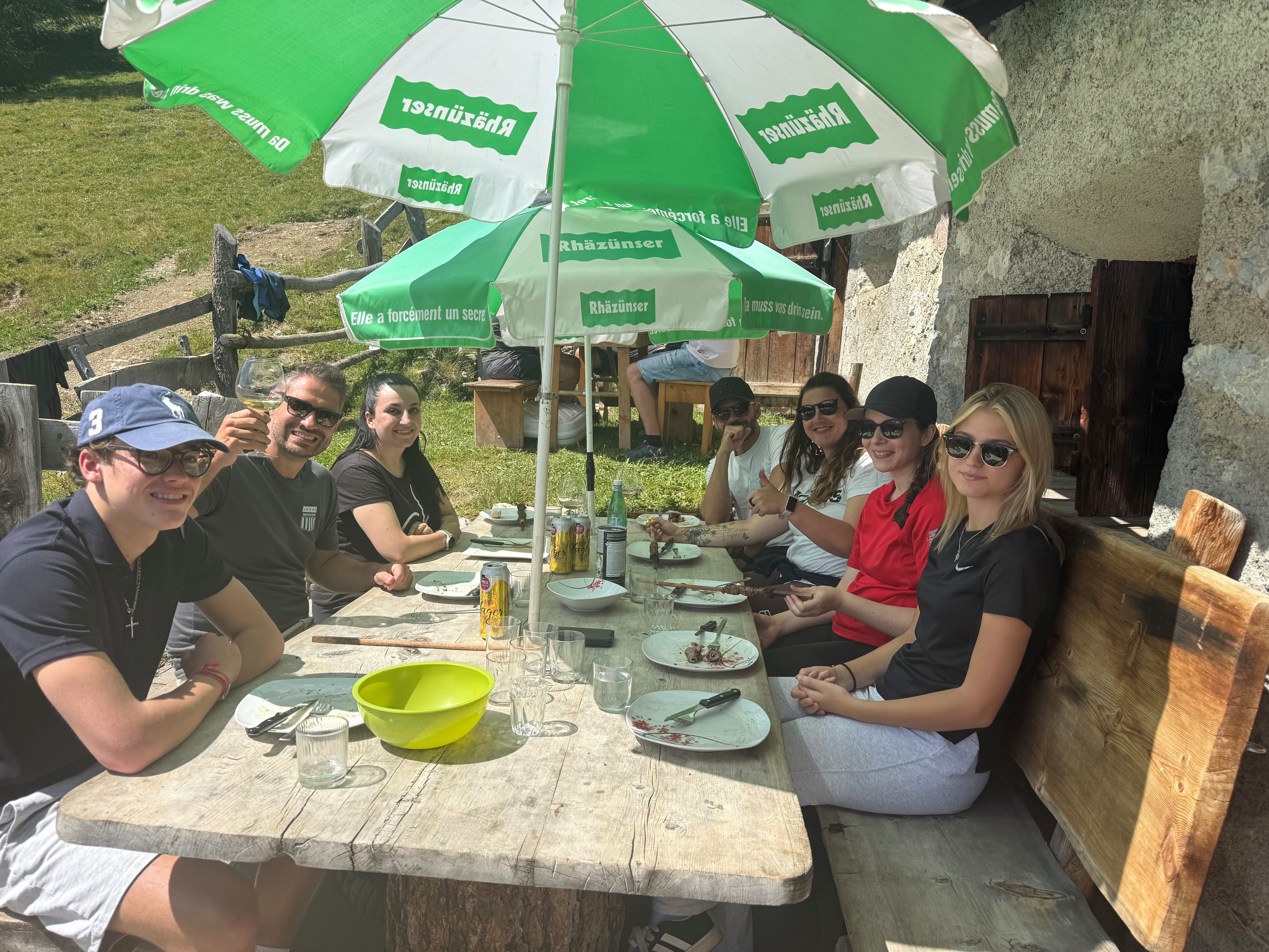 Nach dem Golfen machten wir uns dann auf den Weg zur Hütte von Dumeng Clavuot. Dort angekommen, wurden wir von der gemütlichen Atmosphäre und der schönen Umgebung empfangen. Herr Clavuot und seine Frau Anita Clavuot hatten ein köstliches Essen für uns vorbereitet, was uns nach dem aktiven Vormittag sehr gut schmeckte.